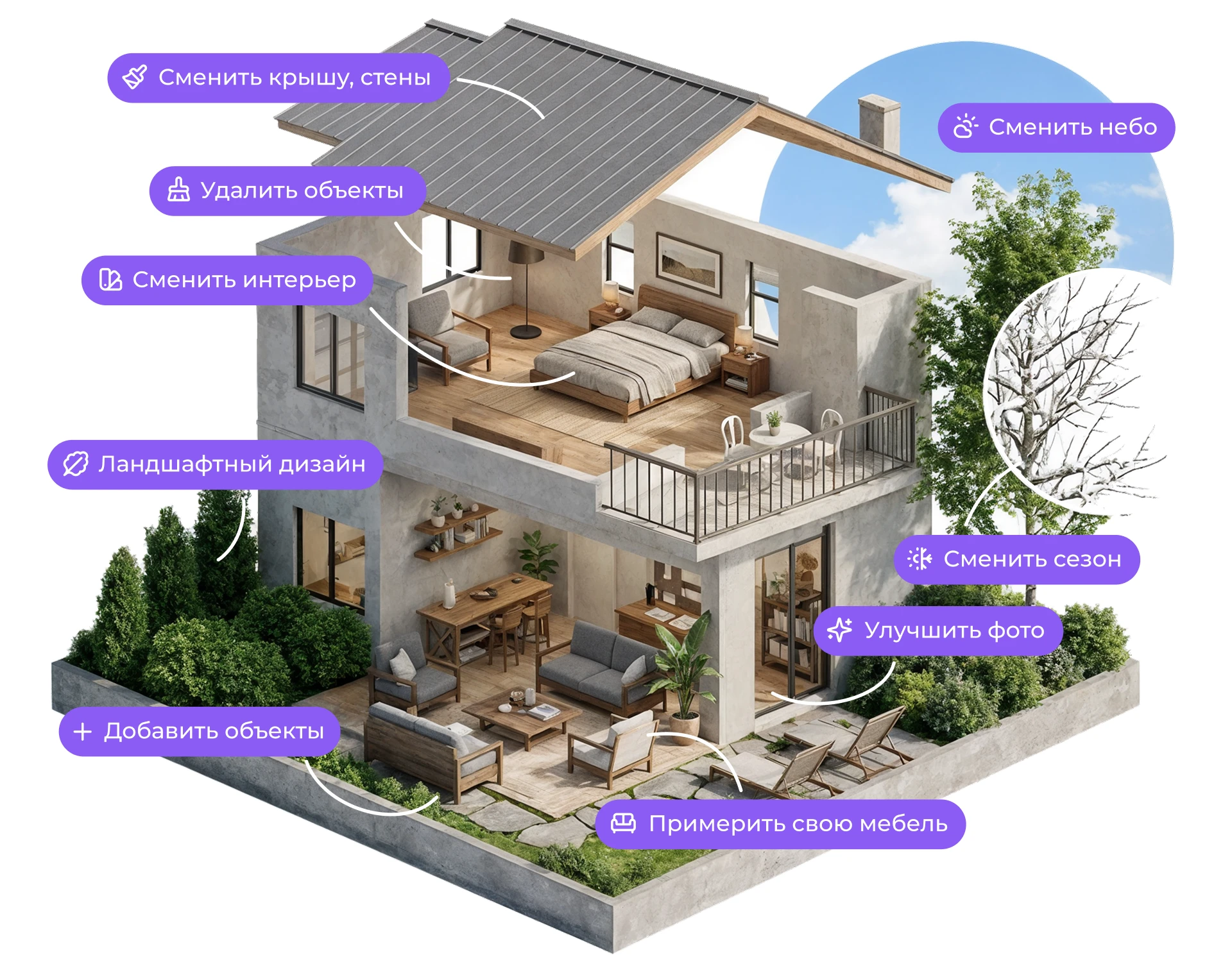 Загрузите фото своей квартиры и создайте интерьер своей мечты с помощью ИИ. Меняйте стиль, удаляйте или добавляйте объекты, корректируйте цвета и материалы — и многое другое.