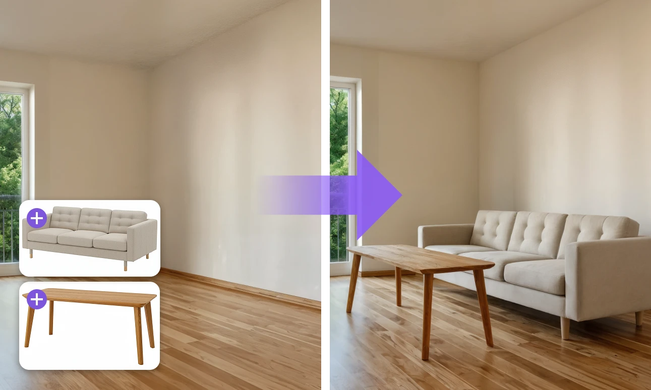 Выбрали мебель и хотите увидеть, как она смотрится в реальной комнате? Загрузите фото помещения и объекты — получите реалистичное изображение.
